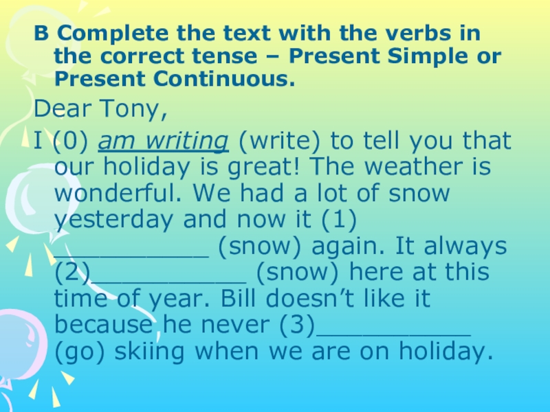 I (0) am writing (write) to tell you that our holiday is great! The weather is wonderful. We had a lot of snow yesterday and now it (1) __________ (snow) again. It always (2)__________ (snow) here at this time of year. Bill doesn’t like it because he never (3)__________ (go) skiing when we are on holiday.