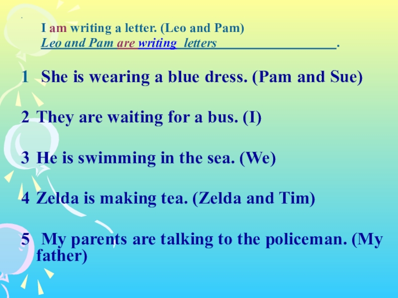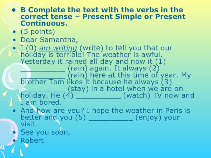 I (0) am writing (write) to tell you that our holiday is terrible! The weather is awful. Yesterday it rained all day and now it (1) __________ (rain) again. It always (2) __________ (rain) here at this time of year. My brother Tom likes it because he always (3) __________ (stay) in a hotel when we are on holiday. He (4) __________ (watch) TV now and I am bored.