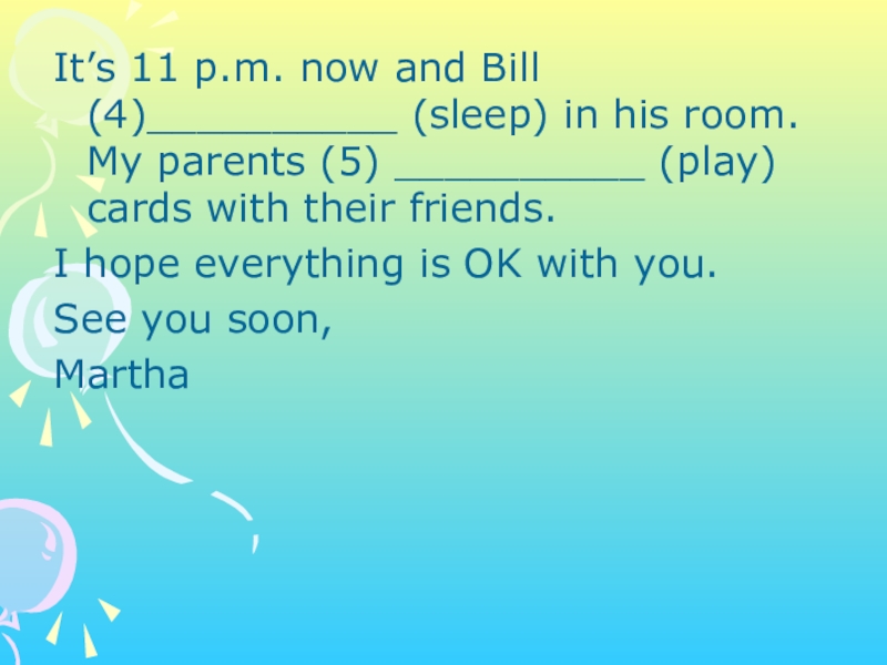 It’s 11 p.m. now and Bill (4)__________ (sleep) in his room.