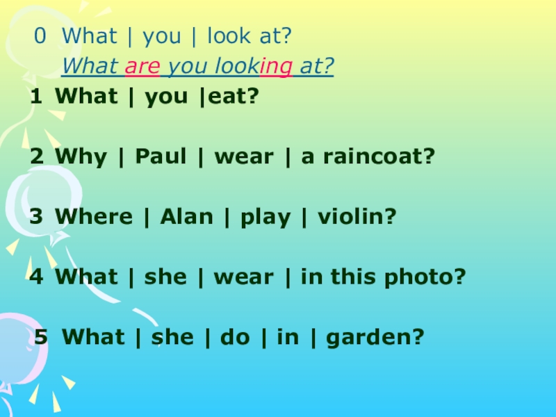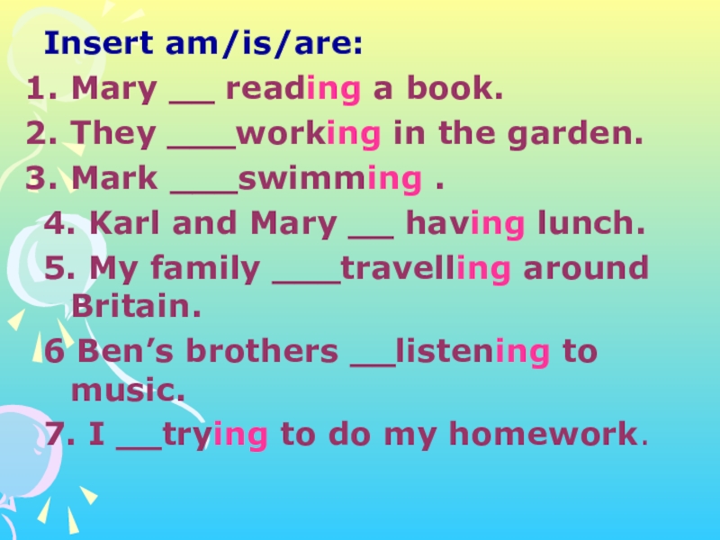 (1 point each) 1 is raining; 2 rains; 3 stays; 4 is watching; 5 are enjoying