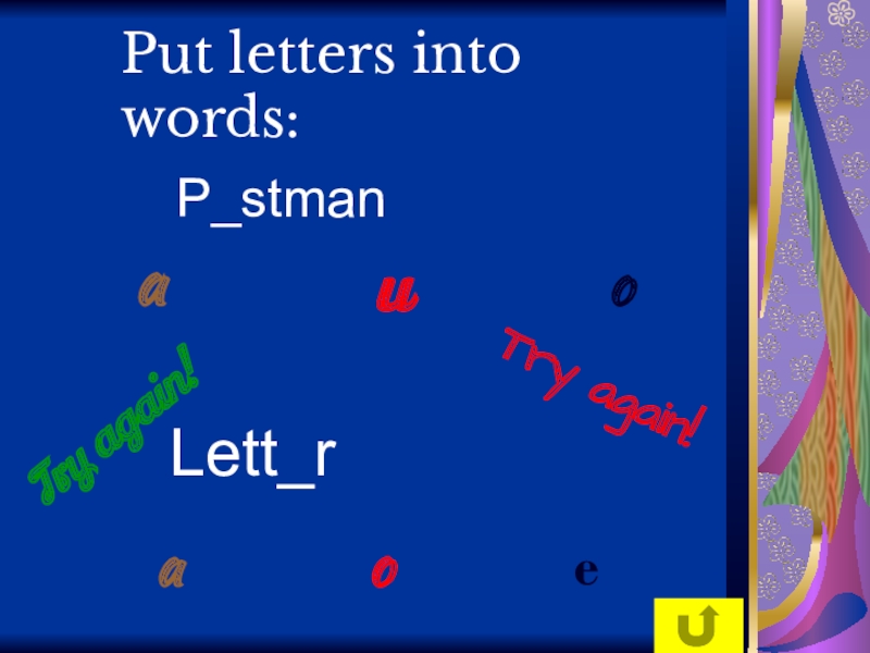 Put letters into words:aouTry again!P_stmanLett_raoeTry again!