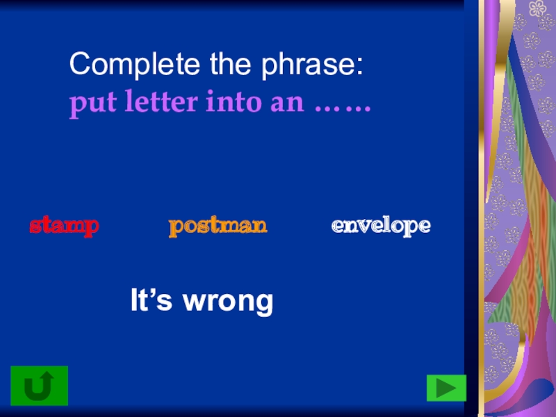Complete the phrase: put letter into an ……stampenvelopepostmanIt’s wrong