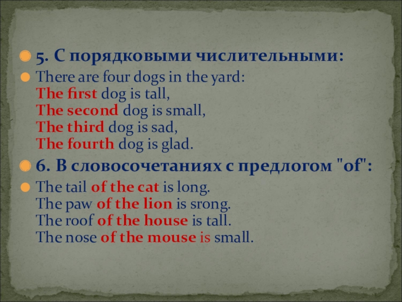 5. С порядковыми числительными:There are four dogs in the yard: The first dog is tall, The second