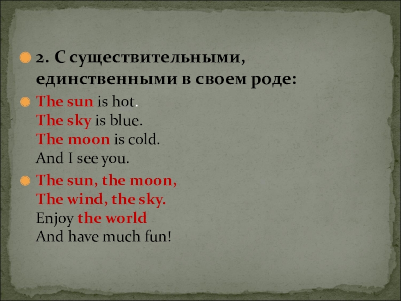 2. С существительными, единственными в своем роде:The sun is hot. The sky is blue. The moon is