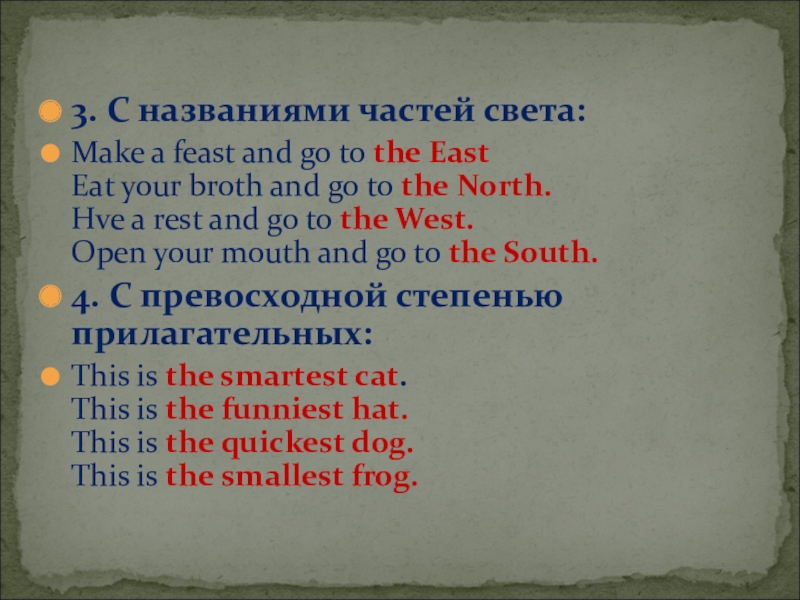3. С названиями частей света:Make a feast and go to the East Eat your broth and go