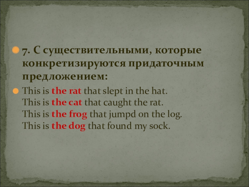 7. С существительными, которые конкретизируются придаточным предложением:This is the rat that slept in the hat. This is