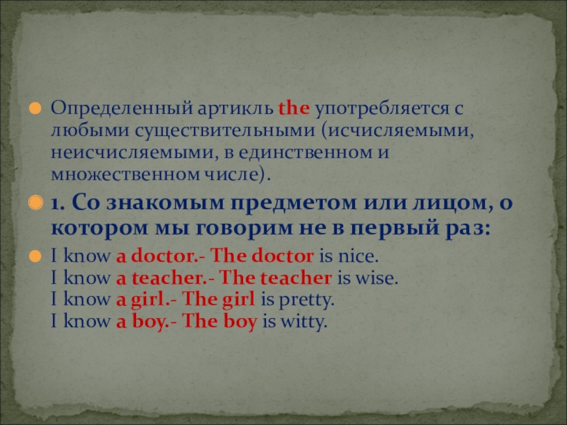 Определенный артикль the употребляется с любыми существительными (исчисляемыми, неисчисляемыми, в единственном и множественном числе). 1. Со знакомым предметом или лицом, о котором мы говорим не в первый раз:I know a doctor.- The doctor is nice. I