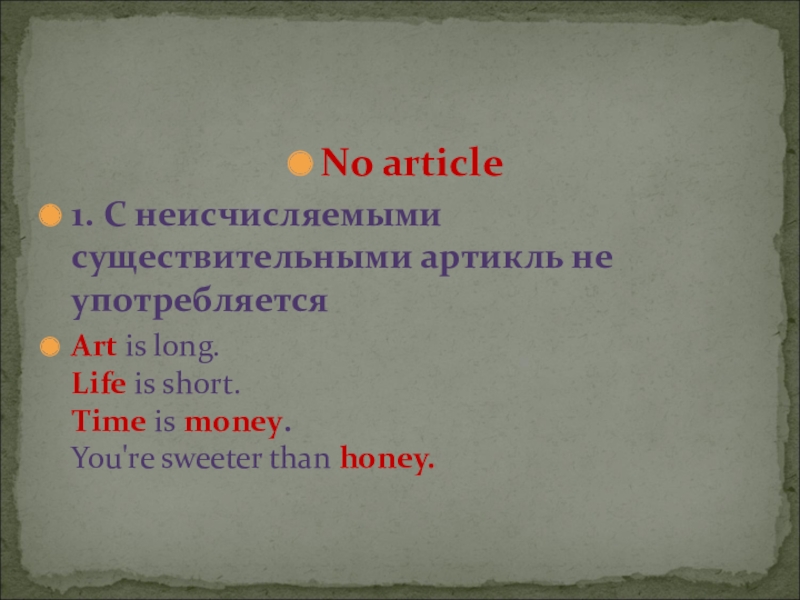 No article 1. C неисчисляемыми существительными артикль не употребляетсяArt is long. Life is short. Time is money.