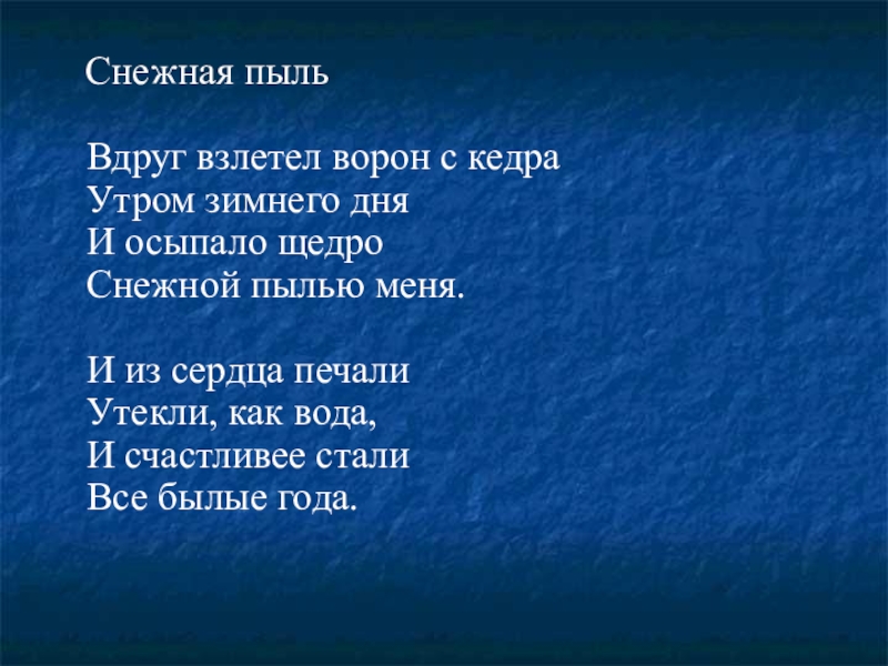 Слайд 7 Снежная пыль Вдруг взлетел ворон с кедра Утром зимнего дня И осыпало