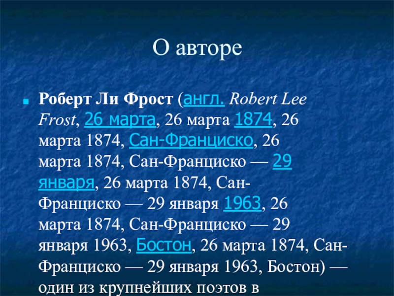 Роберт Ли Фрост (англ. Robert Lee Frost, 26 марта, 26 марта 1874, 26 марта 1874, Сан-Франциско, 26 марта 1874, Сан-Франциско — 29 января, 26