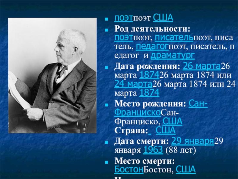 марта 1874, Сан-Франциско — 29 января 1963, 26 марта 1874, Сан-Франциско — 29 января 1963, Бостон, 26 марта 1874, Сан-Франциско — 29 января 1963, Бостон) — один из крупнейших поэтов в истории США, 26 марта 1874, Сан-Франциско — 29 января 1963, Бостон) — один из крупнейших поэтов в истории США, четырежды лауреат Пулитцеровской премии, 26 марта 1874, Сан-Франциско — 29 января 1963, Бостон) — один из крупнейших поэтов в истории США, четырежды лауреат Пулитцеровской премии (1924, 26 марта 1874, Сан-Франциско — 29 января 1963, Бостон) — один из крупнейших поэтов в истории США, четырежды лауреат Пулитцеровской премии (1924, 1931, 26 марта 1874, Сан-Франциско — 29 января 1963, Бостон) — один из крупнейших поэтов в истории США, четырежды лауреат Пулитцеровской премии (1924, 1931, 1937, 26 марта 1874, Сан-Франциско — 29 января 1963, Бостон) — один из крупнейших поэтов в истории США, четырежды лауреат Пулитцеровской премии (1924, 1931, 1937, 1943).