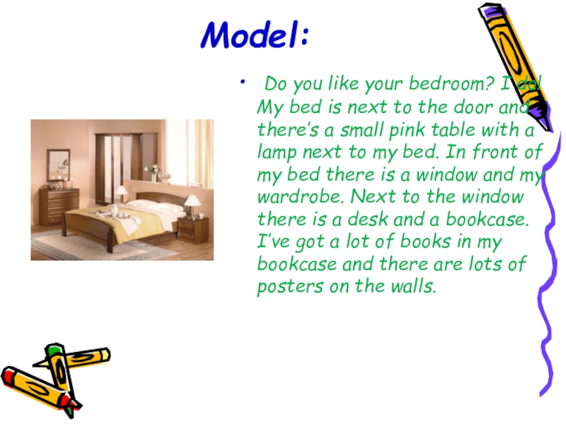 next to the door and there’s a small pink table with a lamp next to my bed. In front of my bed there is a window and my wardrobe. Next to the window there is a desk and a bookcase. I’ve got a lot of books in my bookcase and there are lots of posters on the walls.