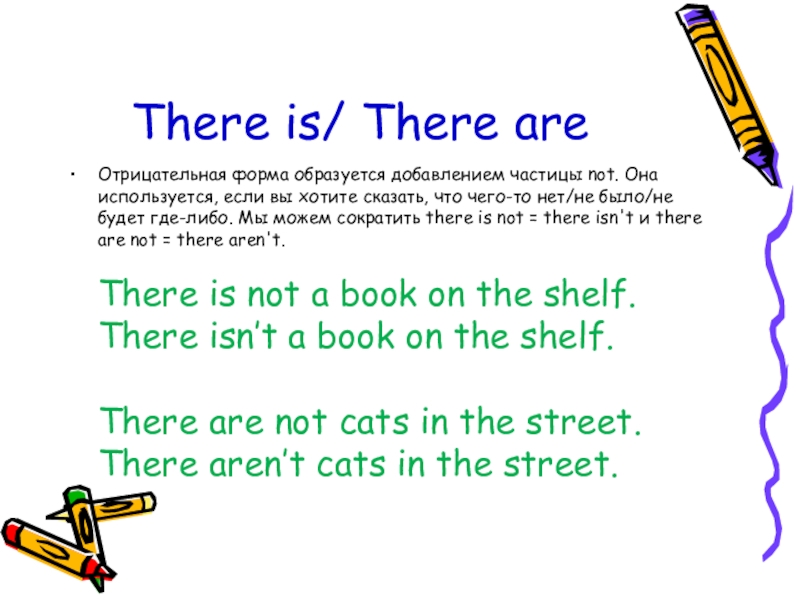 вы хотите сказать, что чего-то нет/не было/не будет где-либо. Мы можем сократить there is not = there isn't и there are not = there aren't.