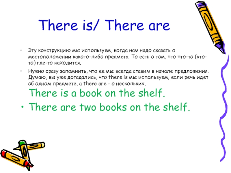 Нужно сразу запомнить, что ее мы всегда ставим в начале предложения. Думаю, вы уже догадались, что there is мы используем, если речь идет об одном предмете, а there are - о нескольких.