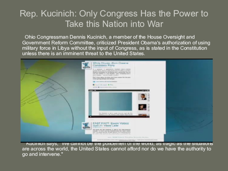 Ohio Congressman Dennis Kucinich, a member of the House Oversight and Government Reform Committee, criticized President Obama's authorization of using military force in Libya without the input of Congress, as is stated in the Constitution unless there is an imminent threat to the United States.