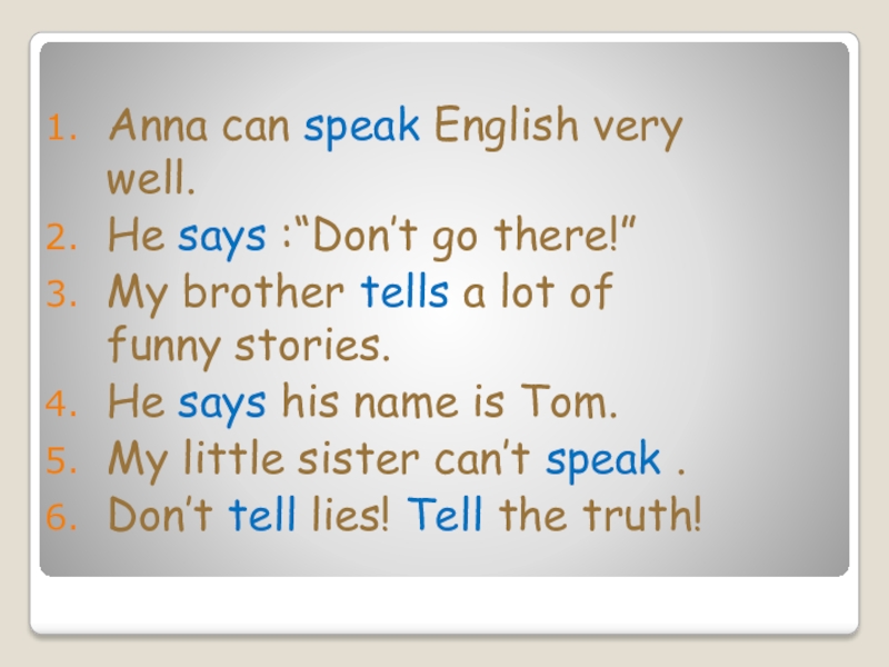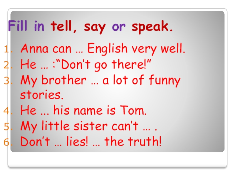 Слайд 22Fill in tell, say or speak.