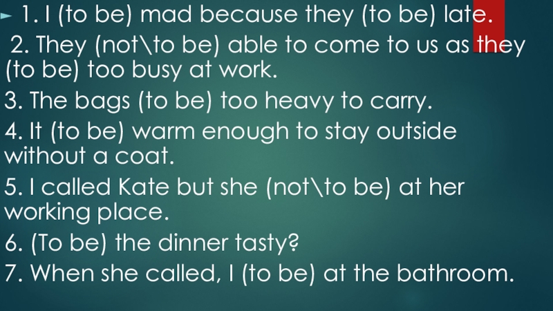 1. I (to be) mad because they (to be) late. 2. They (not\to be) able to come