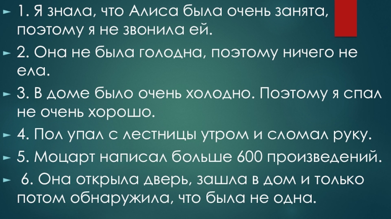1. Я знала, что Алиса была очень занята, поэтому я не звонила ей. 2. Она не была