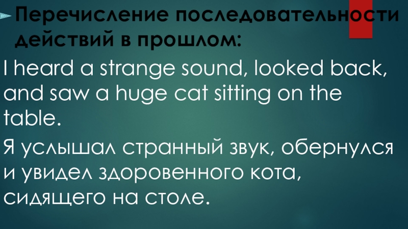 Перечисление последовательности действий в прошлом:I heard a strange sound, looked back, and saw a huge cat sitting