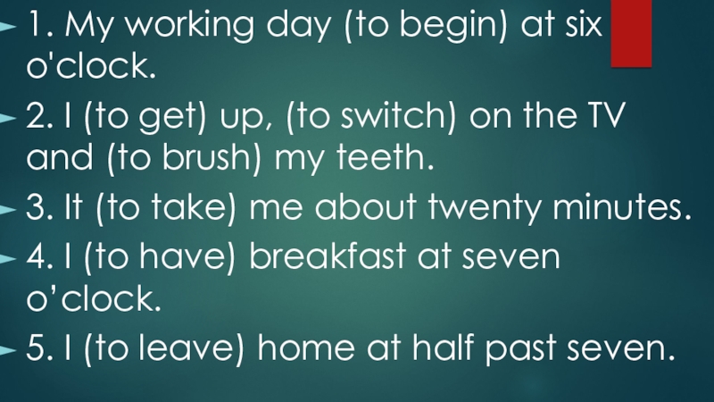 1. My working day (to begin) at six o'clock. 2. I (to get) up, (to switch) on