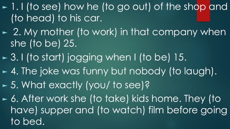 6. After work she (to take) kids home. They (to have) supper and (to watch) film before going to bed.