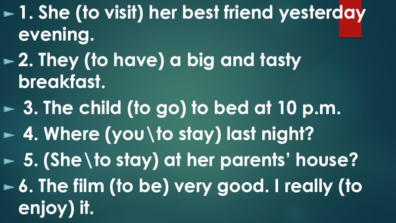 Слайд 61. She (to visit) her best friend yesterday evening.