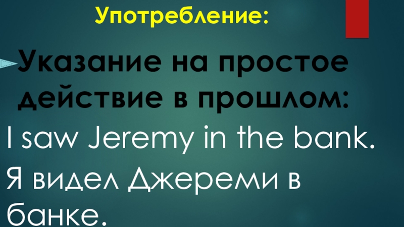 Употребление:Указание на простое действие в прошлом:I saw Jeremy in the bank.Я видел Джереми в банке.