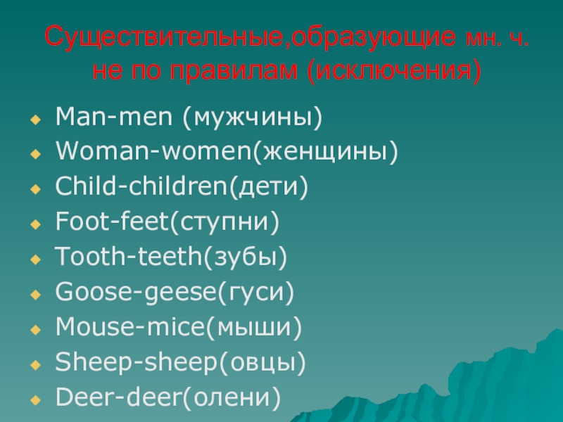 Cуществительные,образующие мн. ч. не по правилам (исключения)Man-men (мужчины)Woman-women(женщины)Child-children(дети)Foot-feet(ступни)Tooth-teeth(зубы)Goose-geese(гуси)Mouse-mice(мыши)Sheep-sheep(овцы)Deer-deer(олени)