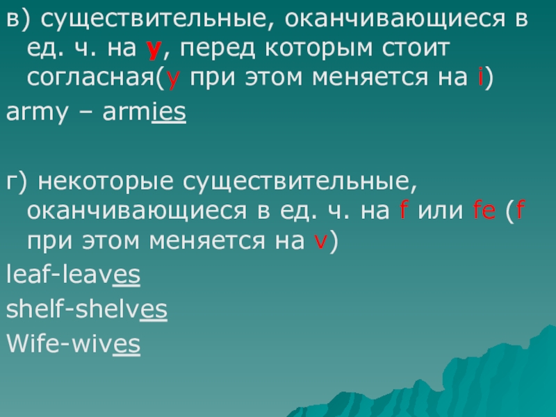 в) существительные, оканчивающиеся в ед. ч. на y, перед которым стоит согласная(y при этом меняется на i)army