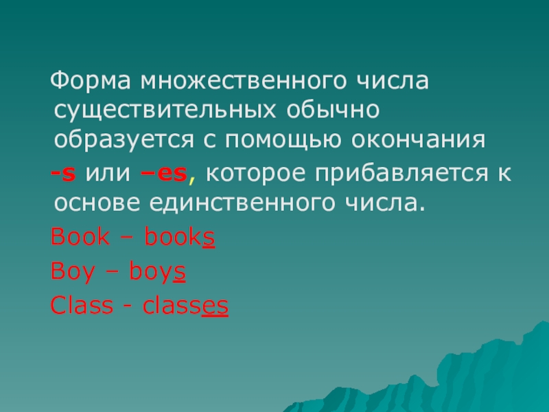 Форма множественного числа существительных обычно образуется с помощью окончания -s или –es, которое прибавляется к основе единственного числа. Book – books Boy – boys Class - classes