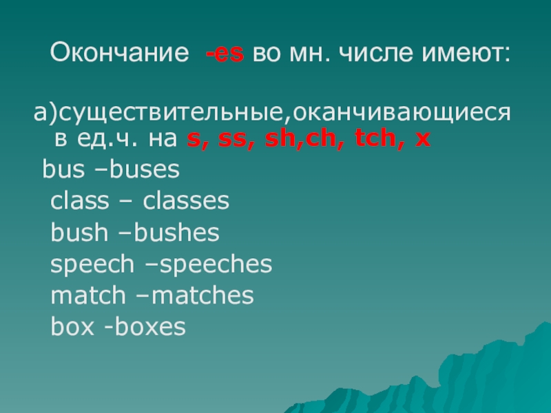 Окончание -es во мн. числе имеют:а)существительные,оканчивающиеся в ед.ч. на s, ss, sh,ch, tch, x bus –buses