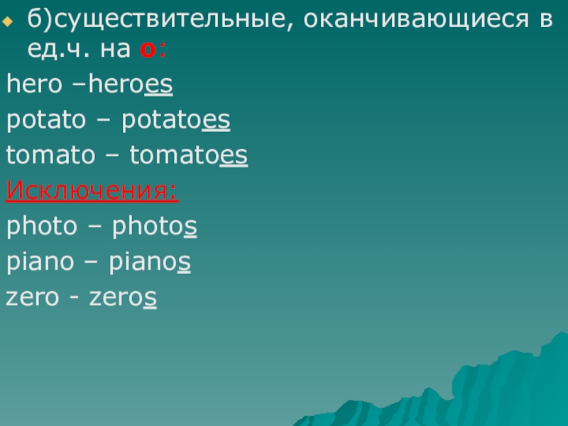б)существительные, оканчивающиеся в ед.ч. на o:hero –heroespotato – potatoestomato – tomatoesИсключения:photo – photospiano – pianoszero - zeros