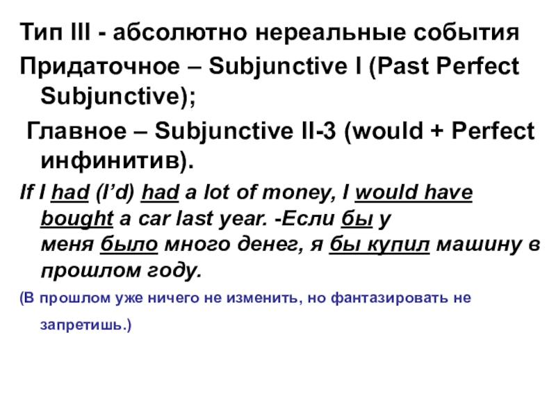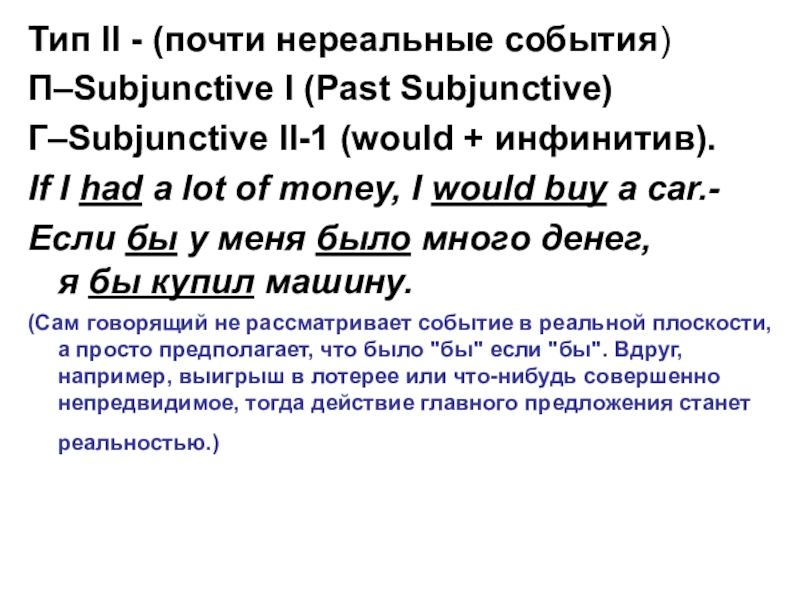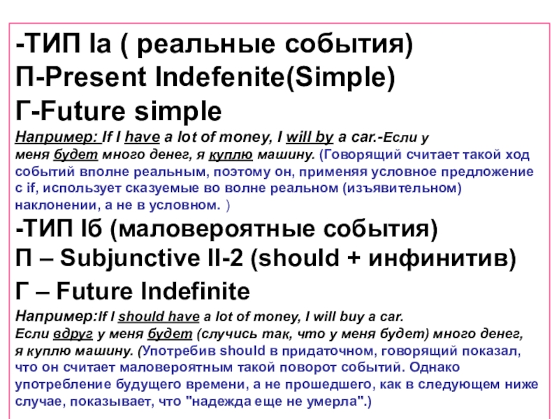 lot of money, I will by a car.-Если у меня будет много денег, я куплю машину. (Говорящий считает такой ход событий вполне реальным, поэтому он, применяя условное предложение с if, использует сказуемые во волне реальном (изъявительном) наклонении, а не в условном. )