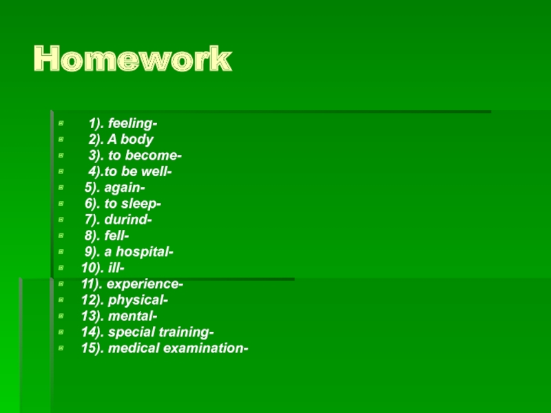Homework  1). feeling-  2). A body  3). to become-  4).to be well- 5).