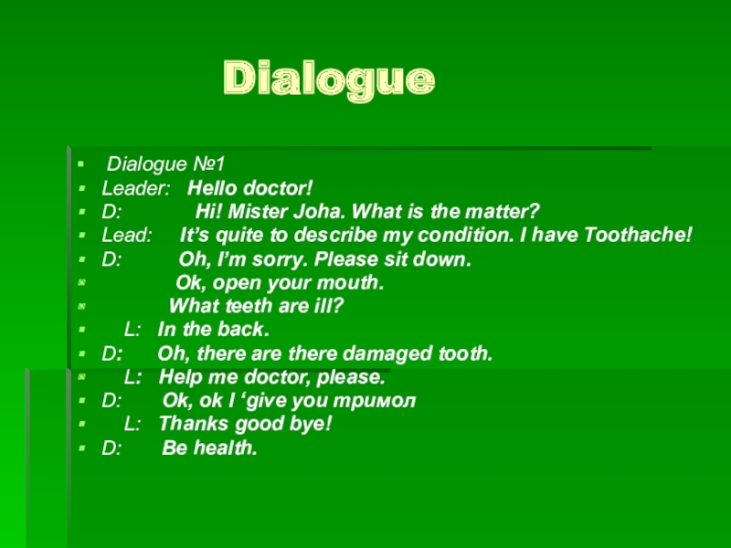 Dialogue Dialogue №1Leader:  Hello doctor!D: