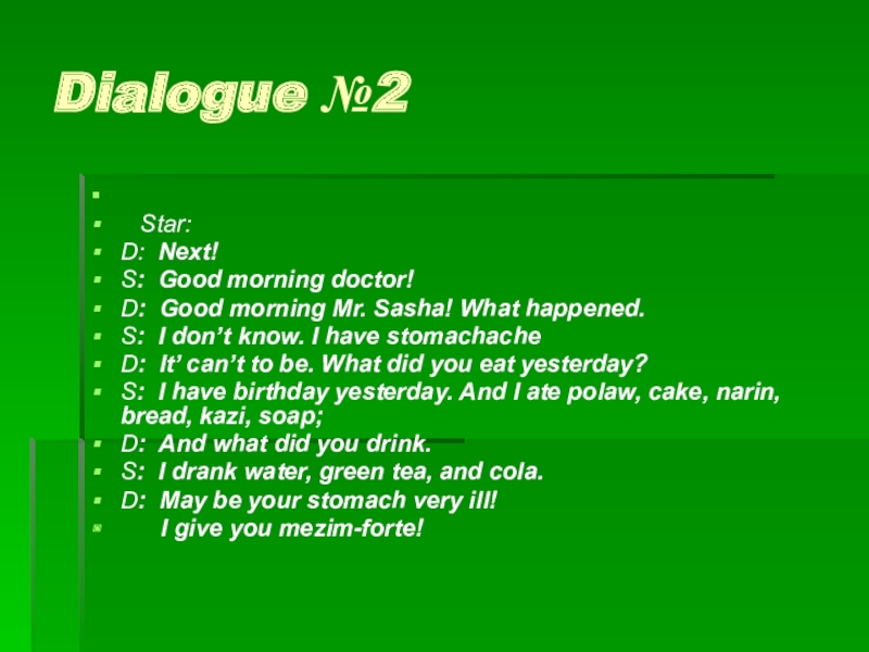 Dialogue №2  Star:D: Next!S: Good morning doctor!D: Good morning Mr. Sasha! What happened.S: I don’t know.