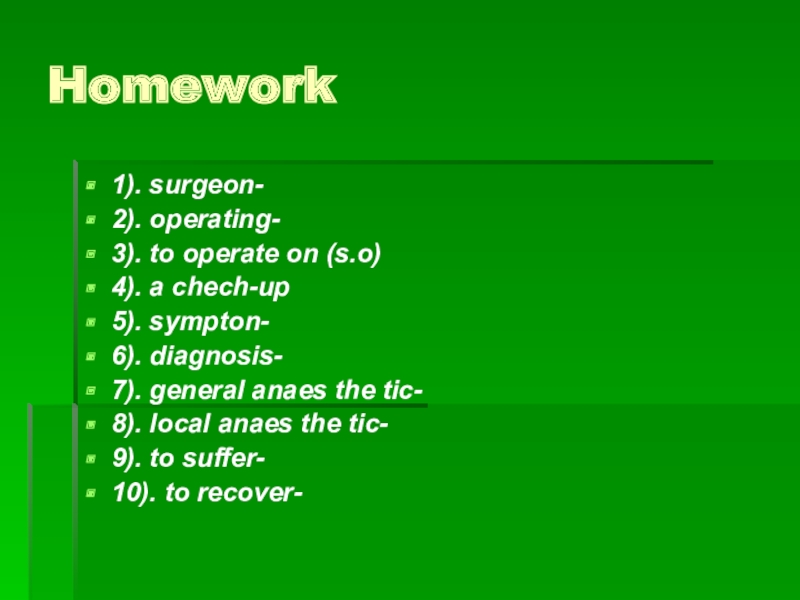 Homework1). surgeon-2). operating-3). to operate on (s.o)4). a chech-up5). sympton-6). diagnosis-7). general anaes the tic-8). local anaes