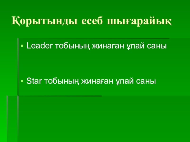 Қорытынды есеб шығарайықLeader тобының жинаған ұпай саны Star тобының жинаған ұпай саны
