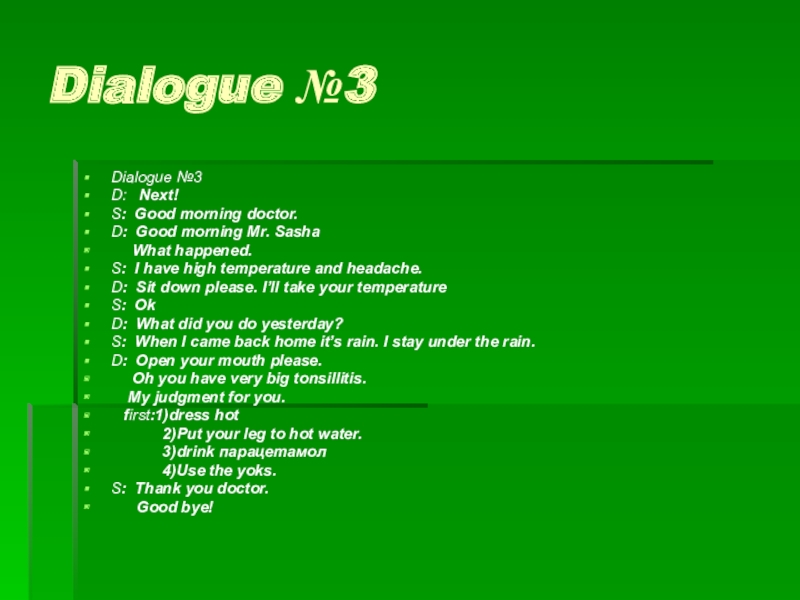 Dialogue №3Dialogue №3D:  Next!S: Good morning doctor.D: Good morning Mr. Sasha   What happened.S: I