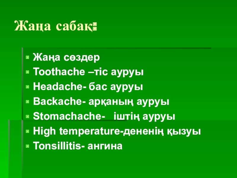 Жаңа сабақ:Жаңа сөздерToothache –тіс ауруыHeadache- бас ауруыBackache- арқаның ауруыStomachache-  іштің ауруыHigh temperature-дененің қызуыTonsillitis- ангина