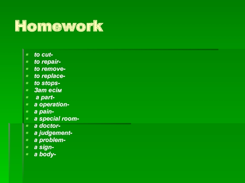 Homeworkto cut- to repair-to remove-to replace-to stops-Зат есім a part-a operation-a pain-a special room-a doctor-a judgement-a problem-a sign-a body-