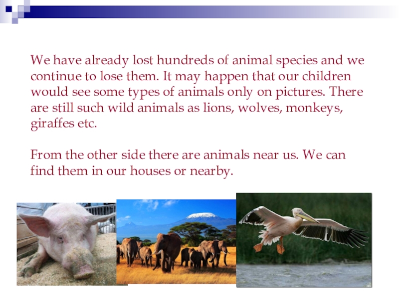 continue to lose them. It may happen that our children would see some types of animals only on pictures. There are still such wild animals as lions, wolves, monkeys, giraffes etc.