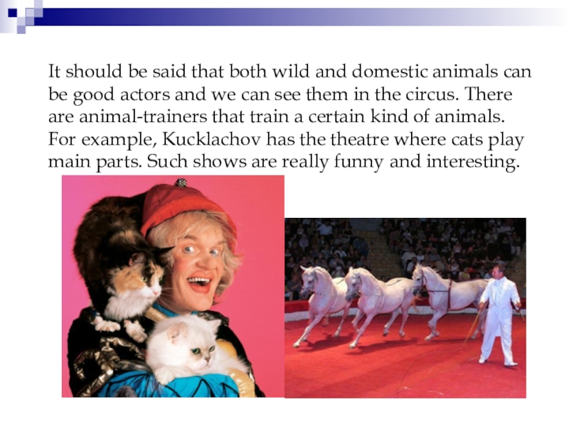 be good actors and we can see them in the circus. There are animal-trainers that train a certain kind of animals. For example, Kucklachov has the theatre where cats play main parts. Such shows are really funny and interesting.