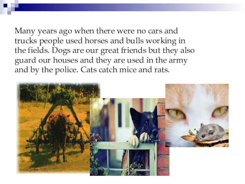 used horses and bulls working in the fields. Dogs are our great friends but they also guard our houses and they are used in the army and by the police. Cats catch mice and rats.