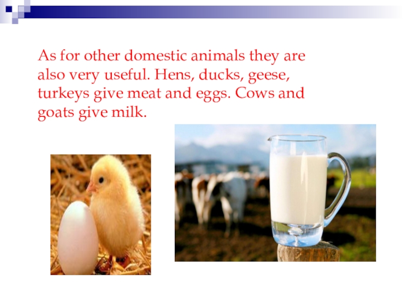 Слайд 8As for other domestic animals they are also very useful. Hens,