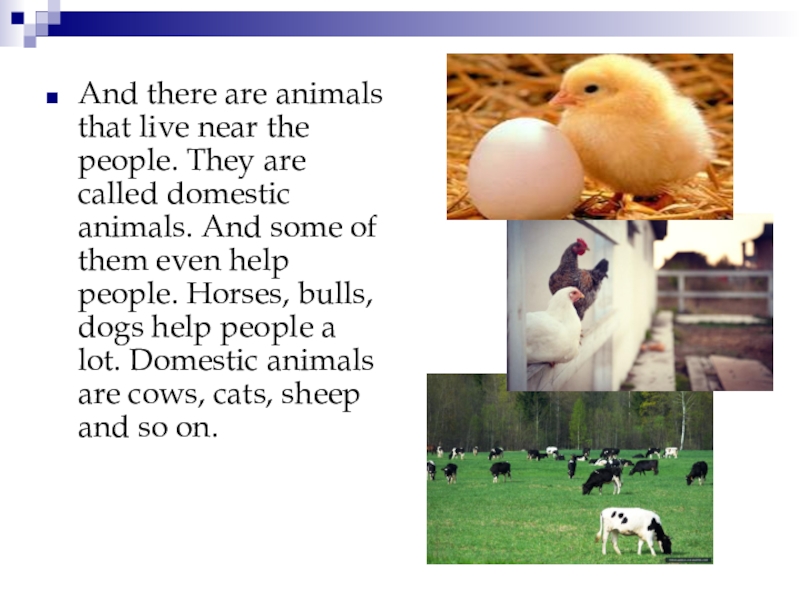 called domestic animals. And some of them even help people. Horses, bulls, dogs help people a lot. Domestic animals are cows, cats, sheep and so on.