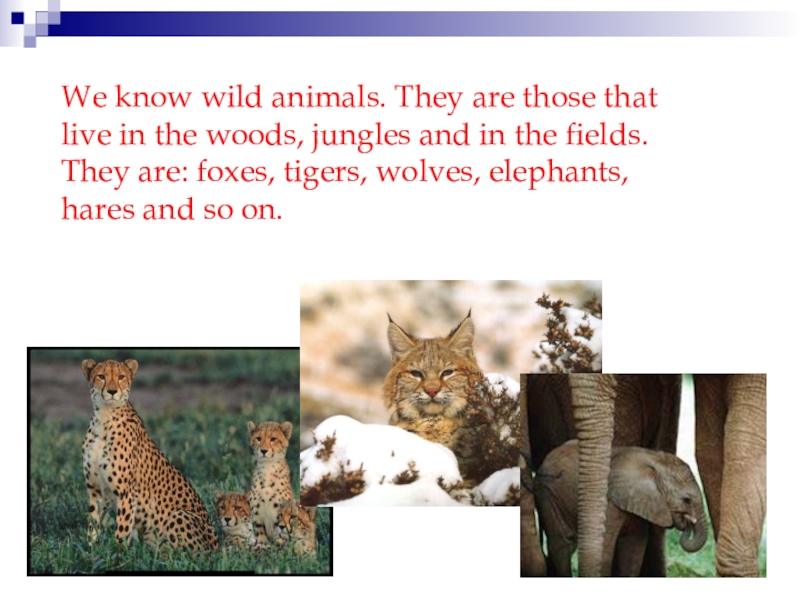 the woods, jungles and in the fields. They are: foxes, tigers, wolves, elephants, hares and so on.