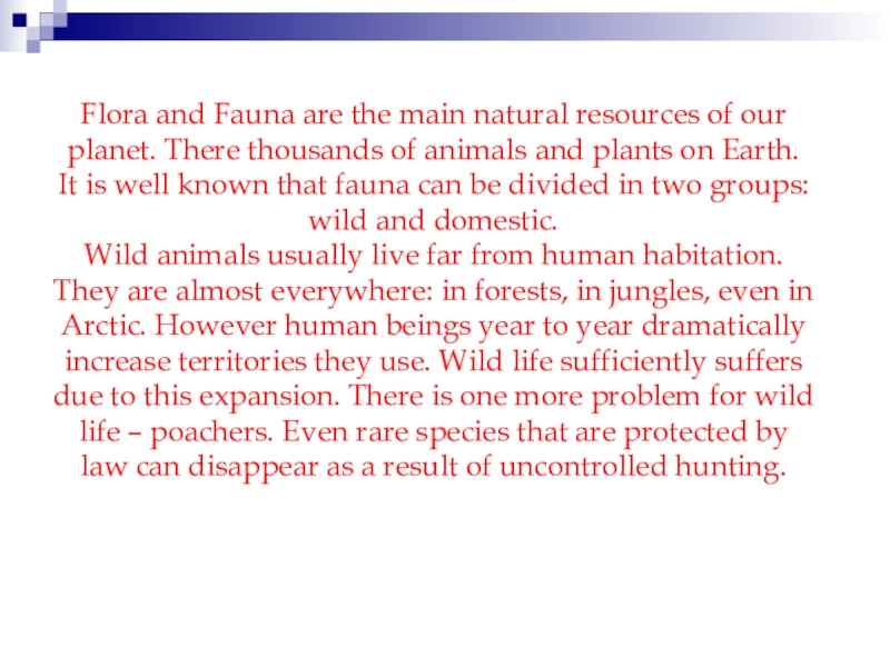 Flora and Fauna are the main natural resources of our planet. There thousands of animals and plants on Earth.It is well known that fauna can be divided in two groups: wild and domestic.Wild animals