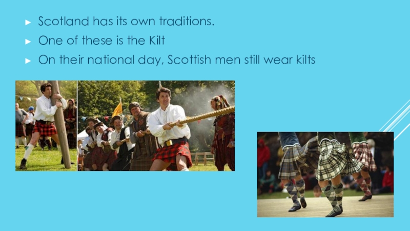 Scotland has its own traditions.One of these is the KiltOn their national day, Scottish men still wear