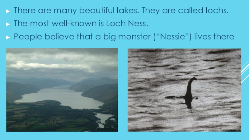 Слайд 5There are many beautiful lakes. They are called lochs.